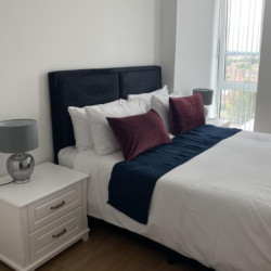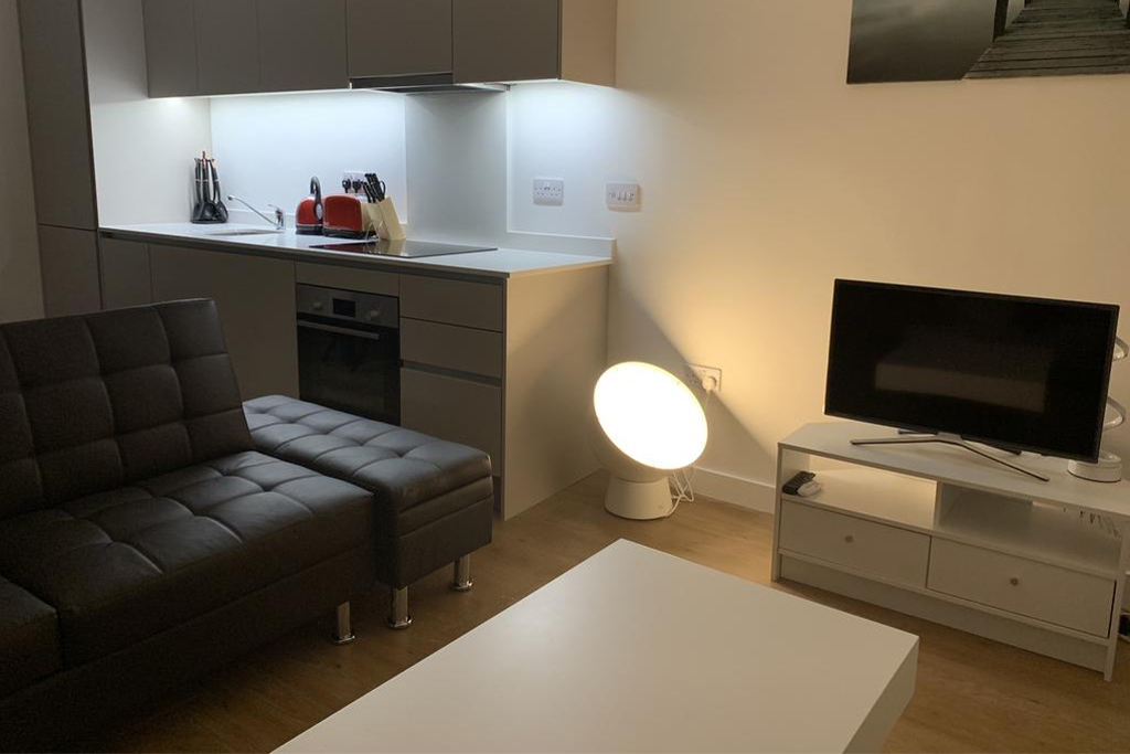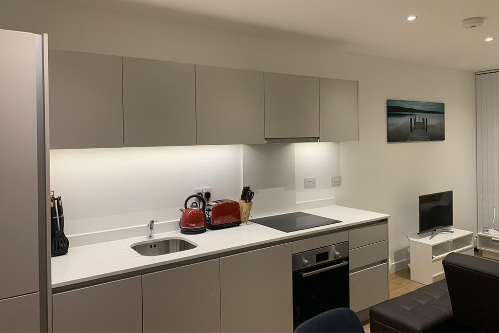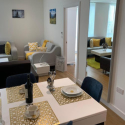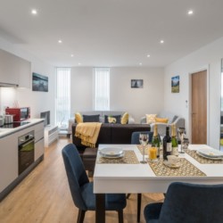 Our superior two-bed business apartments sleep up to 4 people. An office desk and chair + fast 4G WIFI can be found in our business-friendly apartments. Each apartment has a comfortable super king-size bed, a king-size bed in the bedrooms. An extra bed can be added in the living area upon request. Each kitchen is fully equipped. These apartments feature a spacious living room and dining area plus a TV with Netflix so you can wind down after a productive day. Thoughtfully designed and with high specification finishes throughout, the stylish apartments at Royal Winchester House are warm and welcoming.